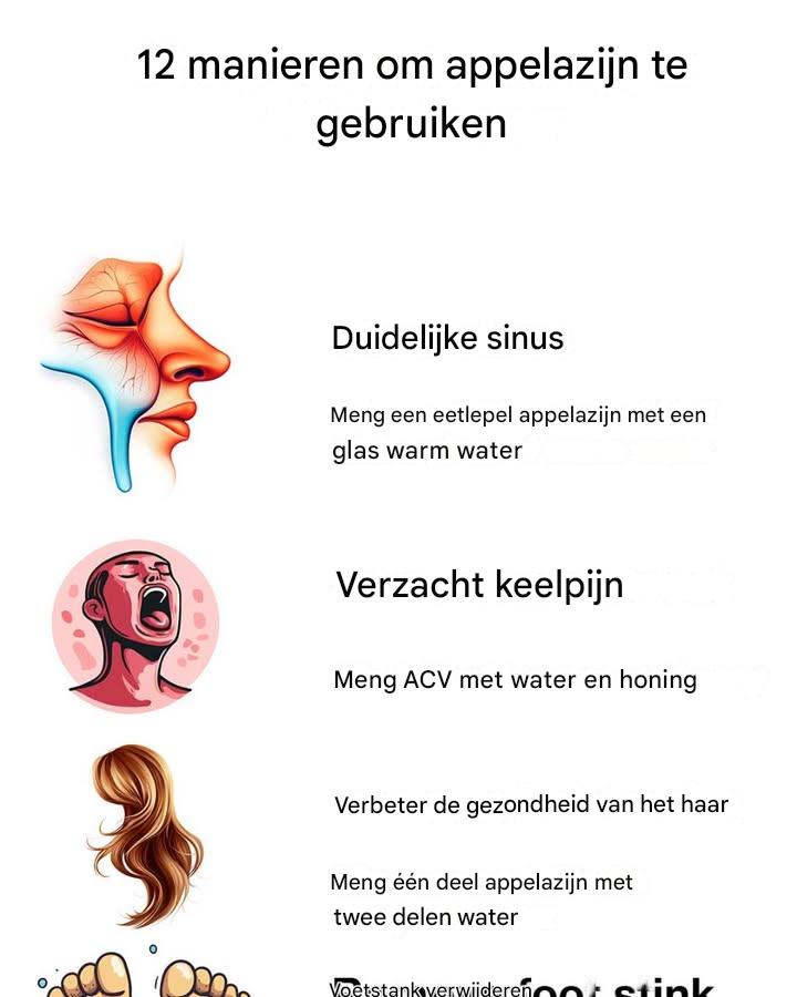 Appelazijn (ACV) wordt al eeuwenlang gebruikt als een natuurlijk middel tegen diverse kwalen. Het wordt gemaakt van gefermenteerd appelsap en bevat azijnzuur en andere nuttige stoffen zoals vitaminen, mineralen en antioxidanten.