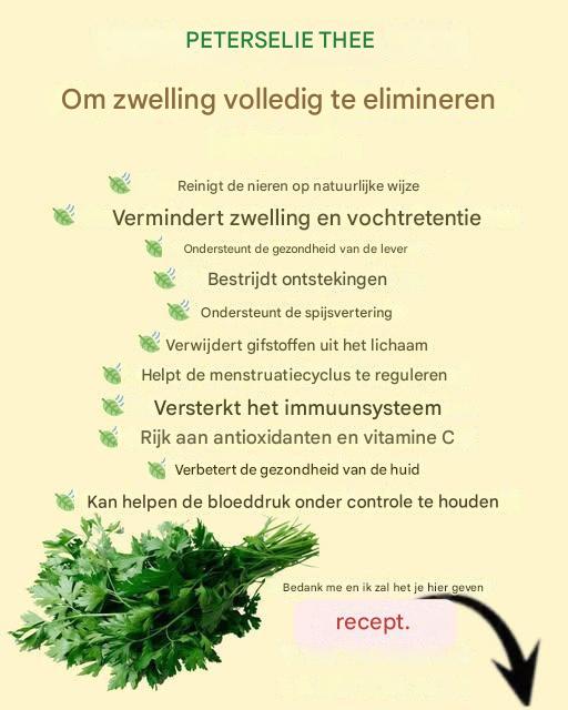 Peterselie is meer dan alleen een culinaire toevoeging – het is een medicinaal kruid met buitengewone gezondheidsbevorderende eigenschappen. Rijk aan vitamine A, C en K, mineralen zoals ijzer en kalium, en antioxidanten, is deze plant een natuurlijke bondgenoot voor het ontgiften van het lichaam, het versterken van het immuunsysteem en het verbeteren van de spijsvertering. Hieronder bespreken we de belangrijkste voordelen, een onfeilbaar recept voor peterseliethee en tips om het potentieel ervan ten volle te benutten.