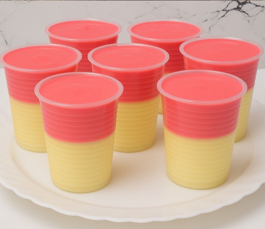 Giet het mengsel in wegwerpbekers (250 ml/8,5 oz) en vul ze tot de helft. U kunt ook dessertglazen gebruiken als u dat liever hebt.
