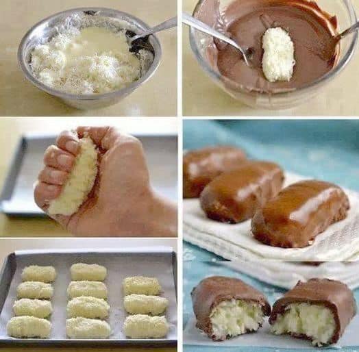- Bestrijk met chocolade: Smelt de chocolade in een magnetronbestendige kom of boven een dubbele boiler. Eenmaal glad, doop je elke kokosreep in de gesmolten chocolade en zorg je ervoor dat deze volledig bedekt is.