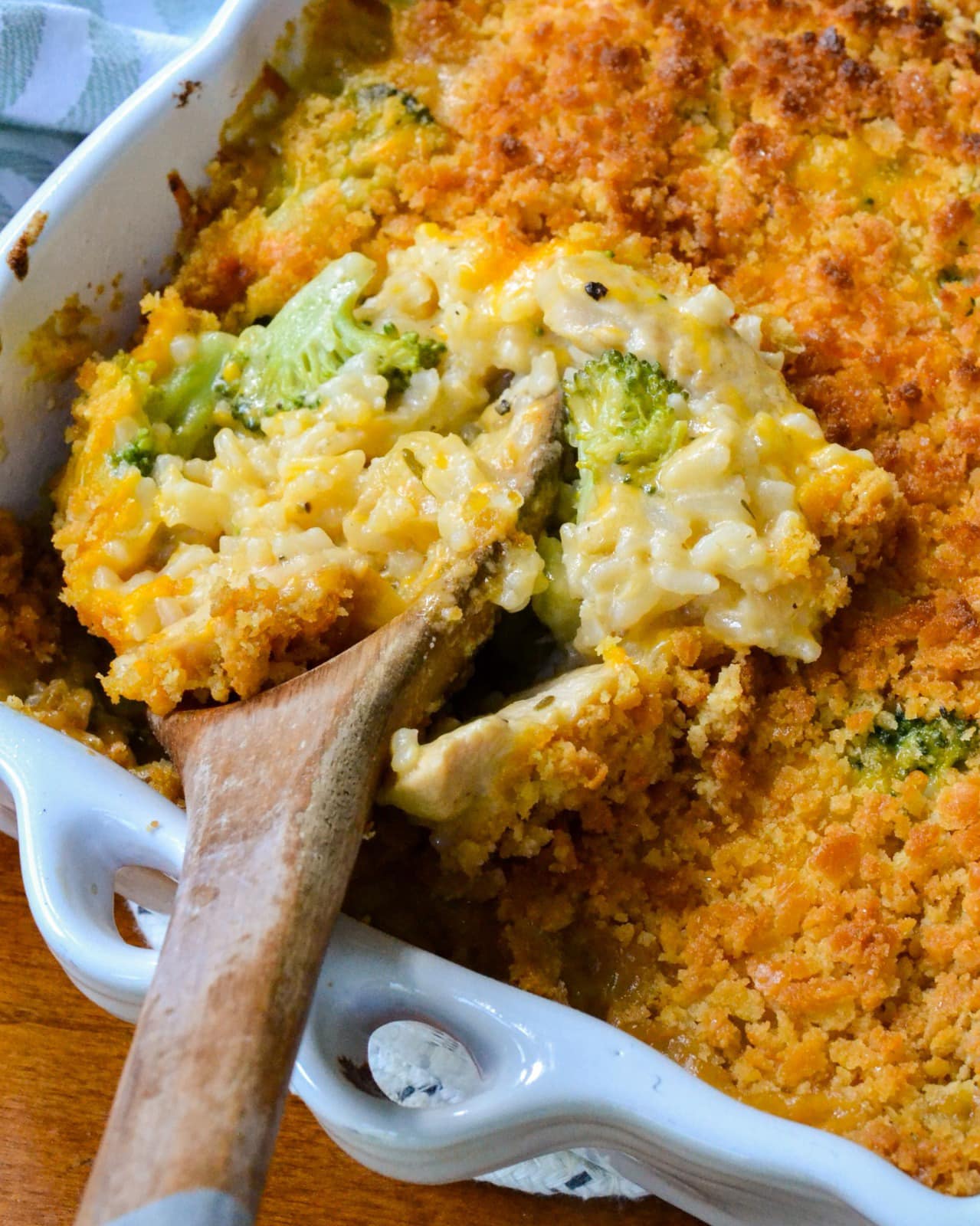Doe de helft van het kipmengsel in de voorbereide ovenschaal en bedek met 1/2 kopje cheddarkaas. Voeg de rest van het kipmengsel toe en bedek met de resterende kaas. Meng crackers en gesmolten boter door elkaar. Strooi over de braadpan en bak 20-25 minuten of tot de bovenkant goudbruin is en de kaas is gesmolten.