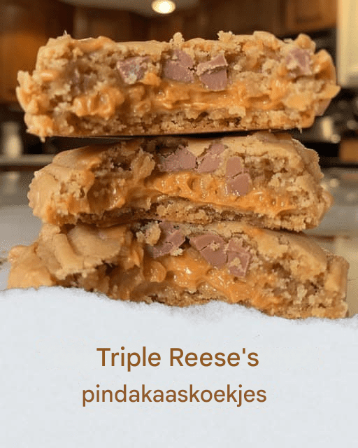 Triple Reese’s Peanut Butter Cookies zijn de droom van elke pindakaasliefhebber. Door romige pindakaas, Reese’s Pieces, Reese’s Peanut Butter Chips en gehakte Reese’s Peanut Butter Cups te combineren, leveren deze koekjes rijke, zoete en nootachtige smaken bij elke hap. Perfect voor elke gelegenheid, ze zijn zacht, taai en gevuld met uitbarstingen van chocolade en pindakaas.