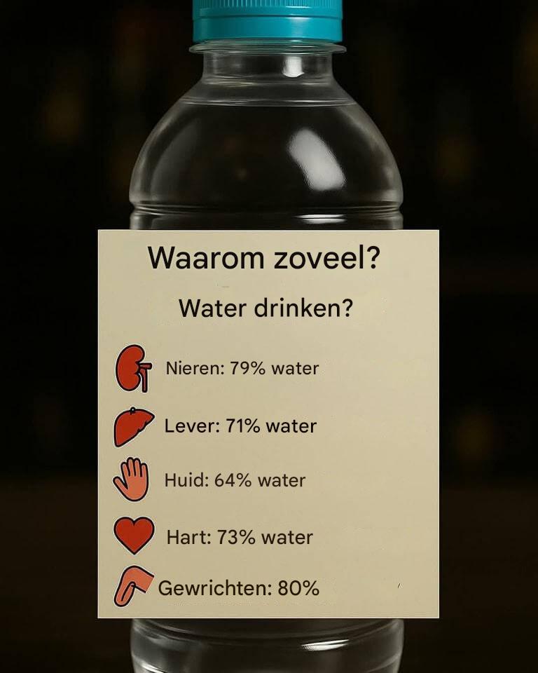 Het menselijk lichaam bestaat voor ongeveer 60% uit water, hoewel dit percentage varieert afhankelijk van leeftijd, geslacht en fysieke conditie. Water is essentieel voor het goed functioneren van het lichaam, omdat het betrokken is bij tal van vitale processen zoals temperatuurregeling, spijsvertering, bloedsomloop en afvalverwerking.
