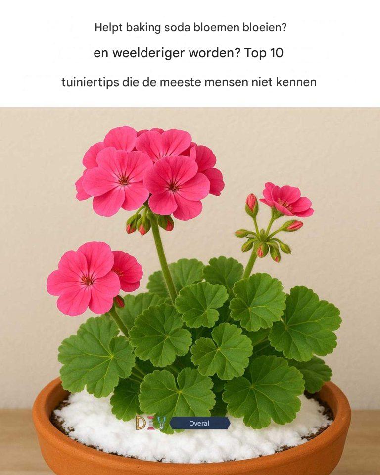 Baking soda, of natriumbicarbonaat, is een veelzijdig huishoudelijk product dat ook wonderen kan verrichten in de tuin. Het helpt de pH-waarde van de grond te verhogen, waardoor deze minder zuur wordt, wat gunstig is voor sommige bloeiende planten zoals geraniums, begonia’s en hortensia’s. Om baking soda op bloemen te gebruiken, los je een eetlepel baking soda op in ongeveer 4 liter water en breng je dit eenmaal per maand aan op de grond rond je planten. Deze oplossing kan bijdragen aan een vollere bloei en gezondere planten.